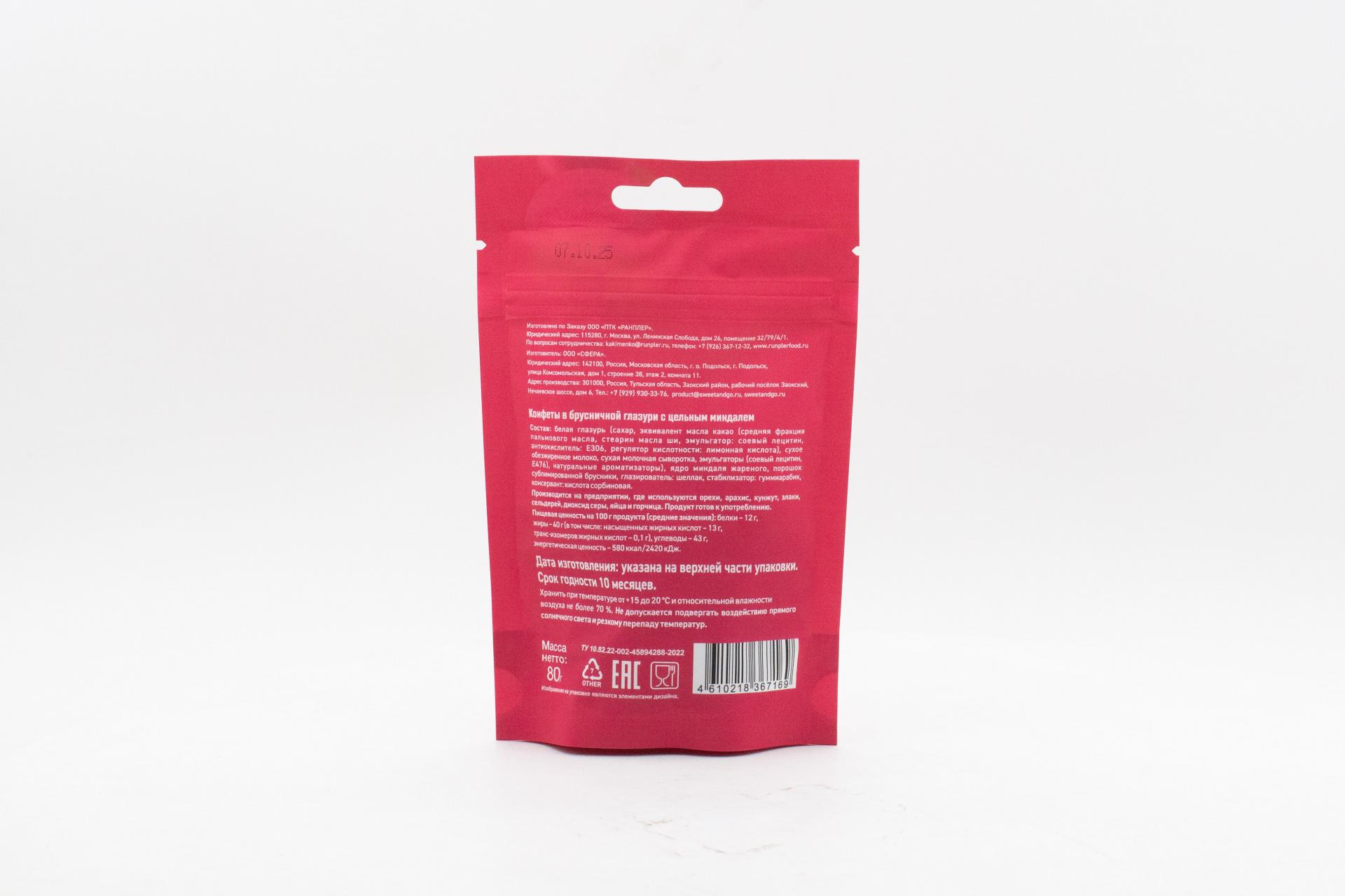 Конфеты Sweet&Go в брусничной глазури с цельным миндалем (Россия) 80г0,00 руб. за штуку (в упак. 15 шт.) |